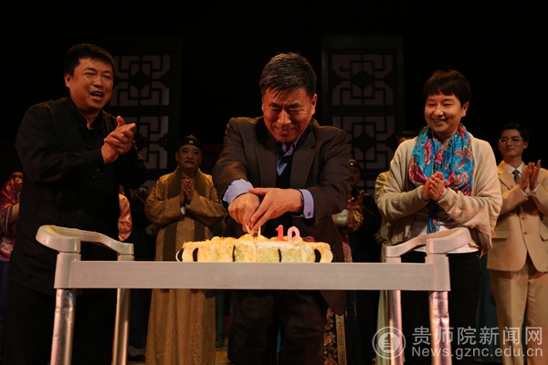 省教育厅副巡视员龚宁(右一)与话剧院负责人一起为《立秋》十岁生日庆生
